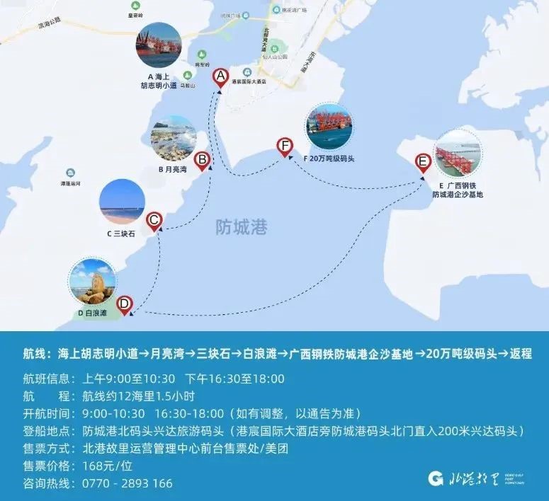 观光航线:海上胡志明小道起点(兴达旅游码头)→马鞍岭旅游码头→万吨级泊位群→月亮湾→海南钢铁防城港企沙基地→20万吨级码头→返程。全程约4海里,航程时间约1小时20分钟。